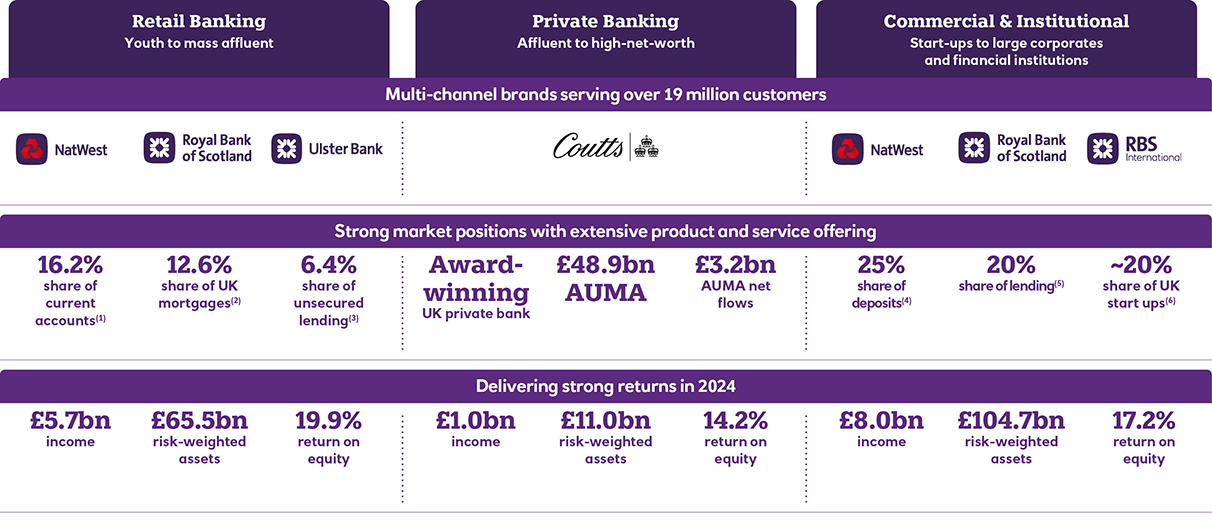 This webpage contains guidance, targets, expectations and trends that represent NatWest Group management’s current expectations, which constitute forward looking statements, and are subject to the risks inherent in statements about the future and to change, including as a result of the factors discussed in NatWest Group plc's 2024 Annual Report and Accounts(including in the section “Risk Factors” included therein) and its other public filings. The actual outcomes may differ materially from those expressed or implied by such forward-looking statements. Accordingly, prospective investors are cautioned not to place undue reliance on such statements, which speak only as of the date made. NatWest Group is under no obligation to update such statements except to the extent legally required.